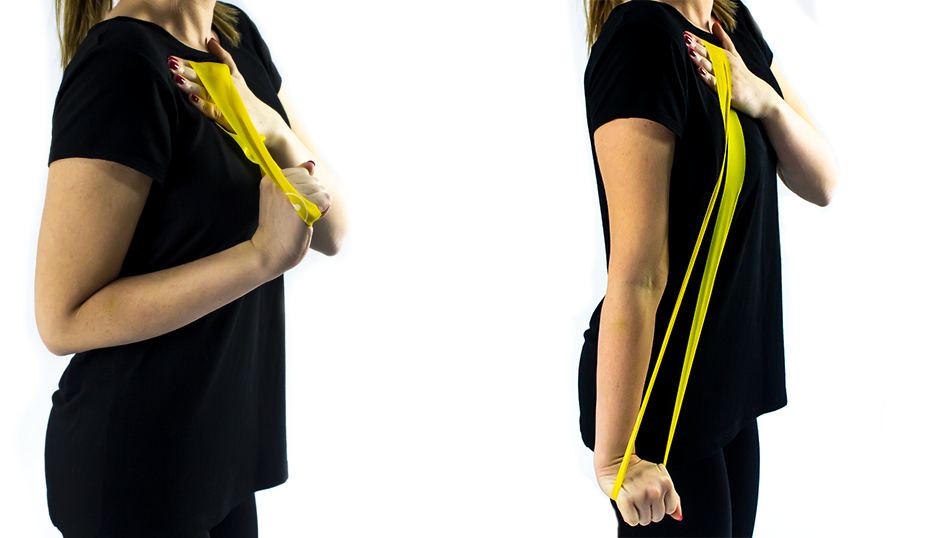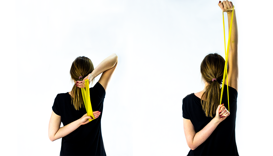 Złap gumę w obie ręce. Jedną dłoń połóż na przeciwległym barku, a drugą rękę zegnij w łokciu. Wykonuj wyprosty, napinając triceps w ostatniej fazie ruchu.