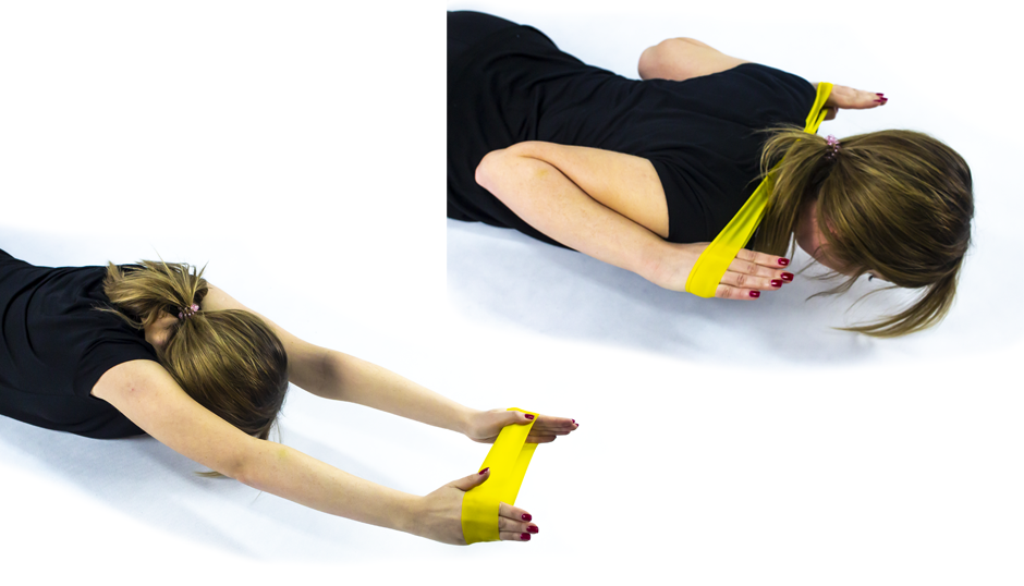 Połóż się na brzuchu, a gumę oporową umieść na dłoniach. Wyprostuj ręce, mają one stanowić przedłużenie Twojego ciała. Patrz w podłogę. Przyciągnij ramiona wraz z gumą, w taki sposób, aby znalazła się na wysokości karku. Ściągnij łopatki. Wytrzymaj w tej pozycji 2 sekundy.