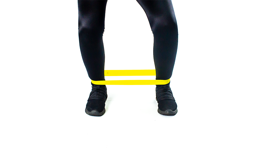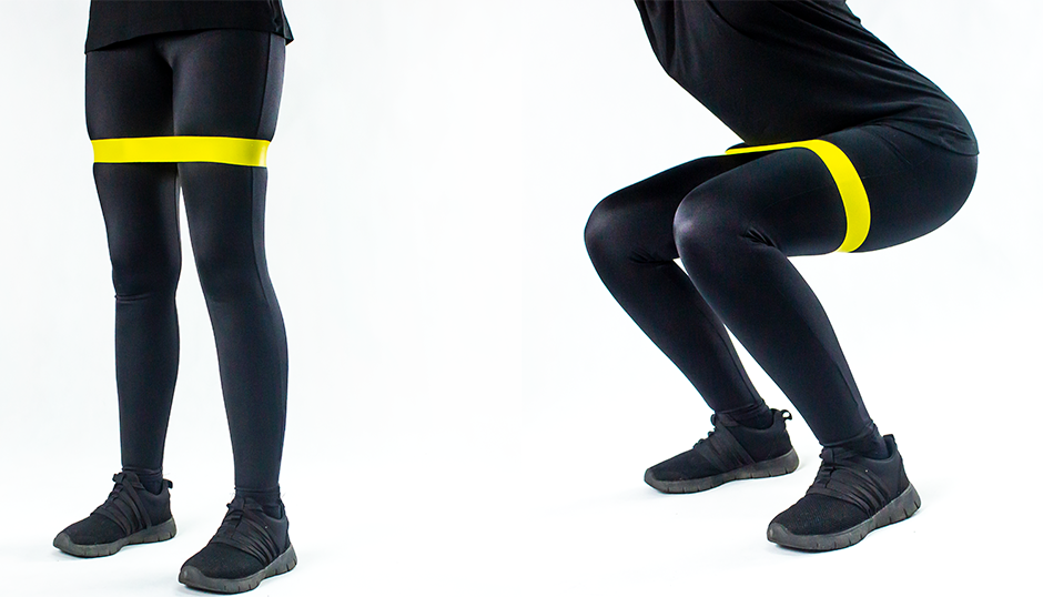 Umieść taśmę nad kolanami, stopy ustaw na szerokość barków. Nie odrywając stóp od podłoża, cofnij biodra w taki sposób, jakbyś miał usiąść na krześle. Pamiętaj, aby nie skręcać kolan do środka, tylko pokonywać nimi opór stawiany przez taśmę. Zatrzymaj się w tej pozycji na sekundę, zepnij pośladki, a następnie wróć do pionu. Przysiad powtórz 15 - 20 razy.