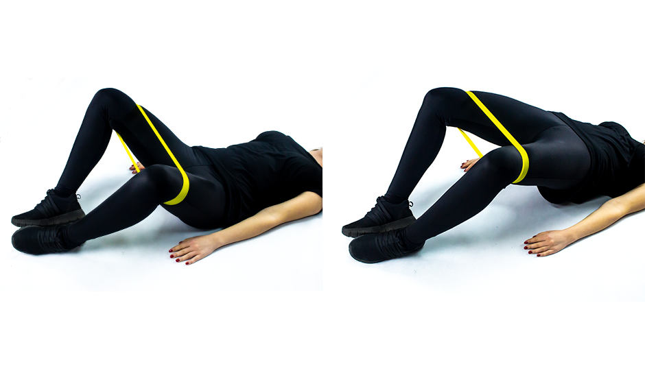 Połóż się na plecach, gumę umieść nad kolanami. Zegnij nogi w kolanach, podeszwy stóp skieruj ku sobie. Unieś miednicę do góry, tak aby znalazła się w jednej linii z tułowiem. Kolana ustaw na zewnątrz. Utrzymaj tę pozycję przez 3 sekundy, następnie wróć do leżenia na plecach. Powtórz ćwiczenie 10 - 12 razy.