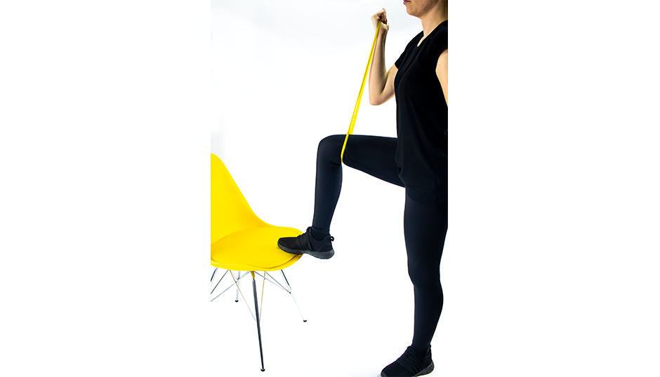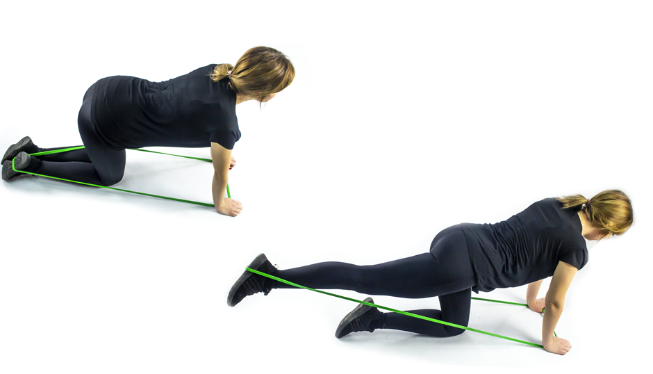 Przyjmij pozycję klęku w podporze. Zahacz gumę o podeszwę stopy, a drugą część trzymaj dłońmi. Powolnym ruchem wyprostuj nogę, napinając gumę i wróć do pozycji wyjściowej. Powtórz ćwiczenie 15 - 20 razy na każdą nogę.